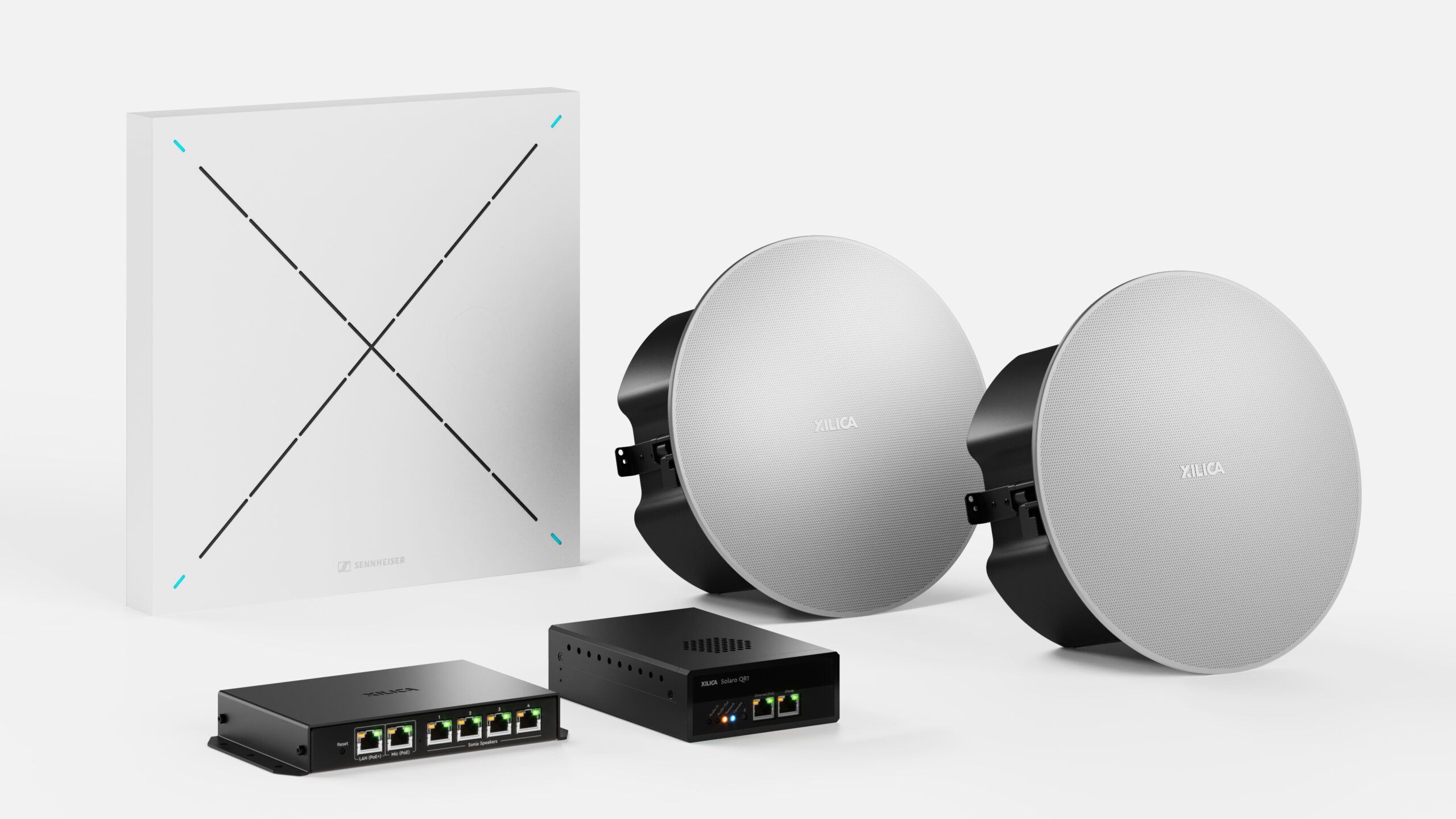 - Xilica Solaro QR1-UC DSP: A powerful digital signal processor that powers the entire system via PoE, ensuring efficient audio processing and integration.